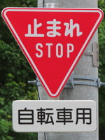 一方通行路(自転車を除く)の逆行側で行われている「一時停止」規制です。当然ながら、規制の対象は自転車しかないので、補助標識「自転車用」が併設されています。
