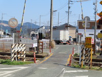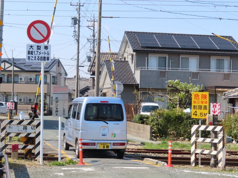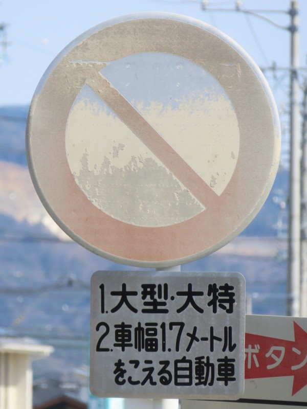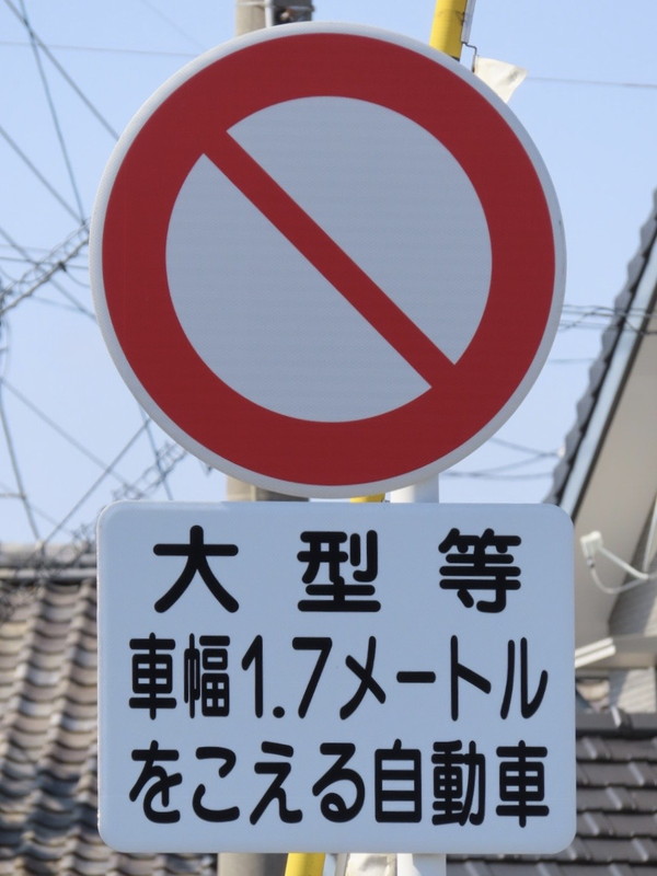 ご覧の通り道幅の狭い踏切で、「大型等」と「車幅1.7mを超える自動車」が通行止めになっています。