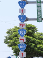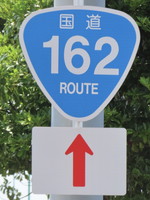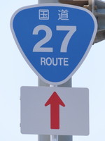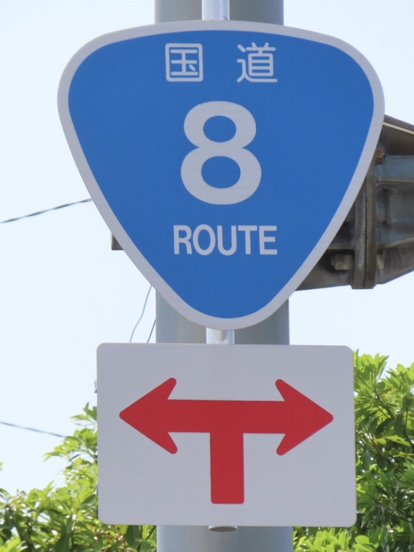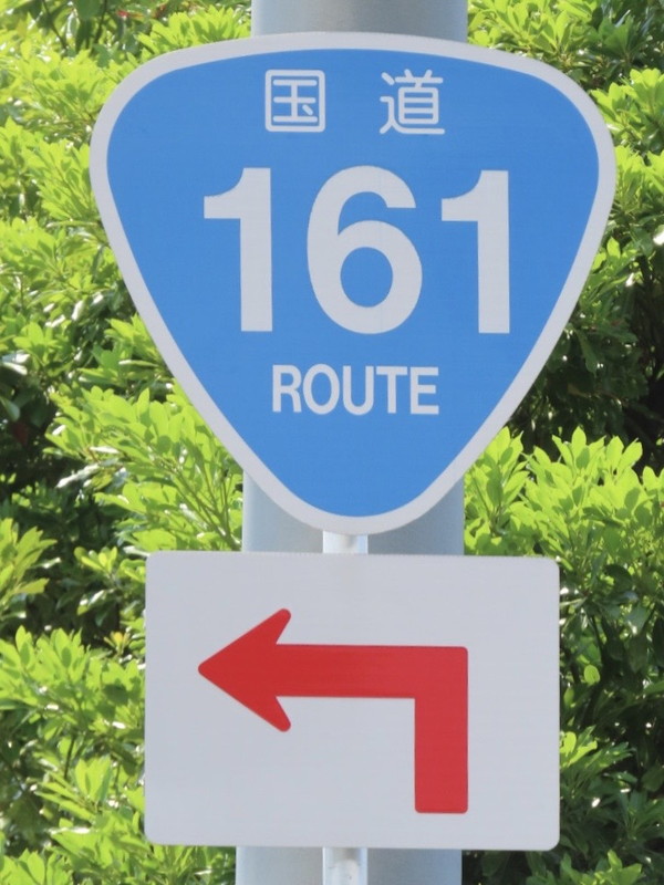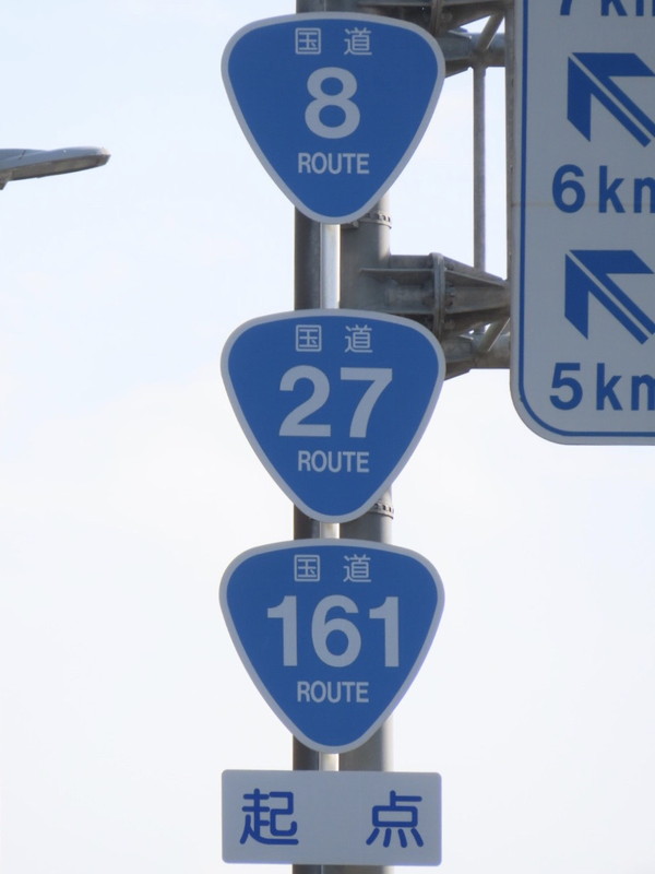 敦賀市の「岡山町1丁目」交差点付近に設置されている、「国道番号」標識が4つ並んだ、通称「4連おにぎり」です。 手前のR8バイパス坂ノ下ランプからこの「岡山町1丁目」交差点までは、R8,R27,R161,R162の4つの国道が重複しており、この交差点から4国道がそれぞれ分岐しています。このことを案内するため、各標識に「方向」の補助標識を附置しています。 また、「国道番号」標識を複数設置する場合、番号の若い方を上に設置しますが、この道路はR27のイメージが強いのか、R27標識をR8標識より上の最上部に設置しているようです。 |