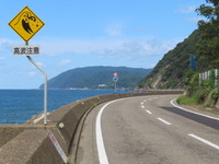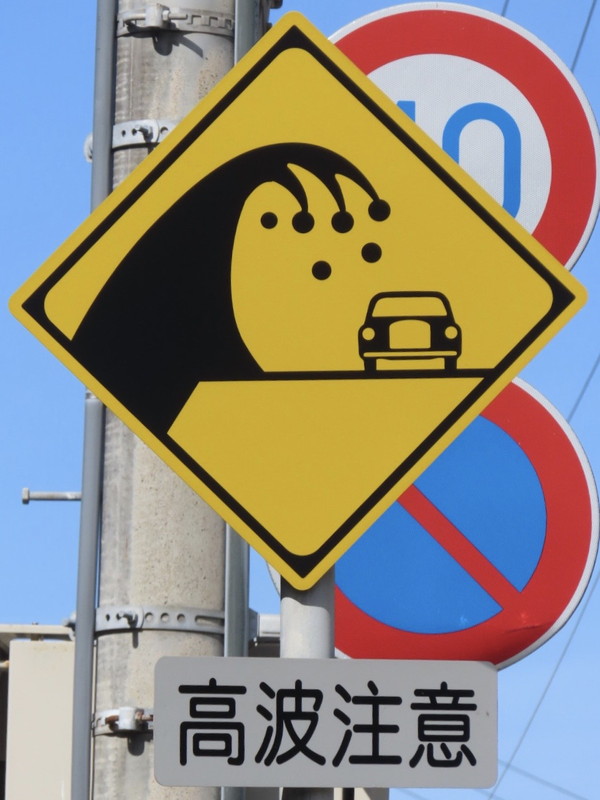海岸沿いの道路です。イラストでは、大きな波がクルマを襲っています。