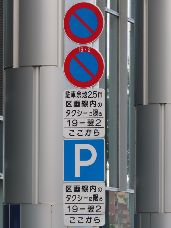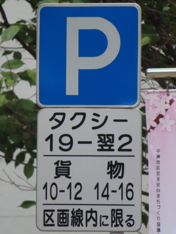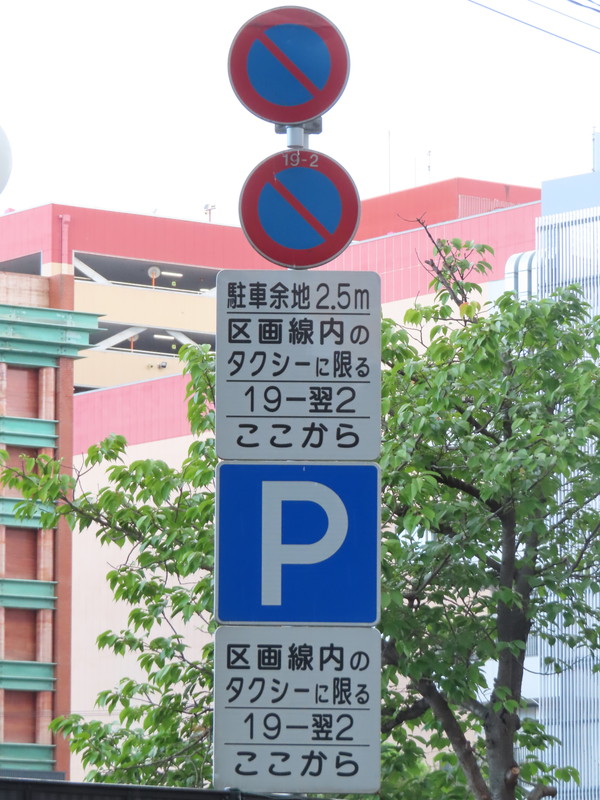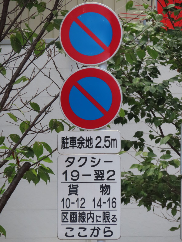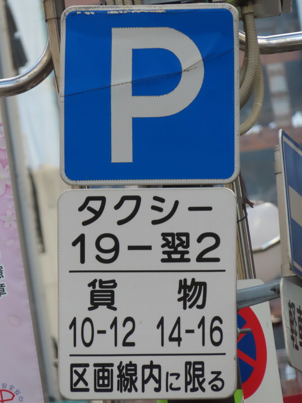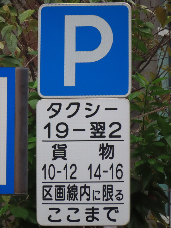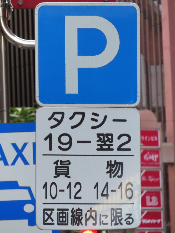 「全車両は終日駐車してはいけない」・「19時‐翌2時のタクシー、10時‐12時及び14時‐16時の貨物は駐車区画線に駐車する場合、右側に2.5m以上の余地を取らなければならない」(駐車余地)・「19時‐翌2時のタクシー、10時‐12時及び14時‐16時の貨物は駐車区画線内に限り駐車することができる」(駐車可)となります。