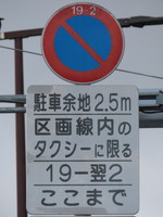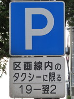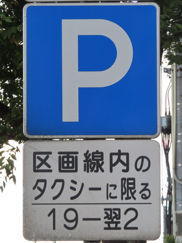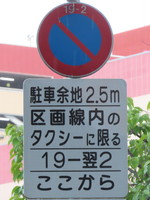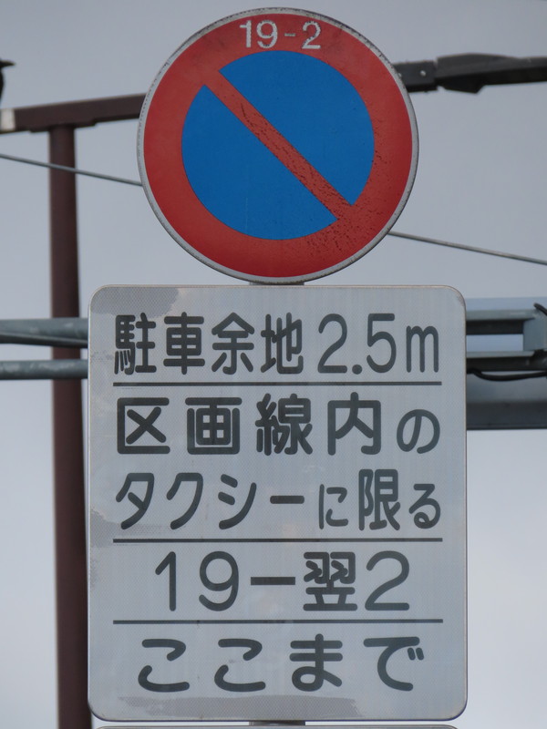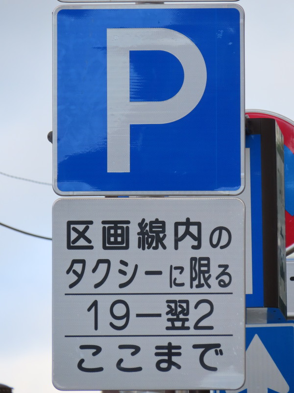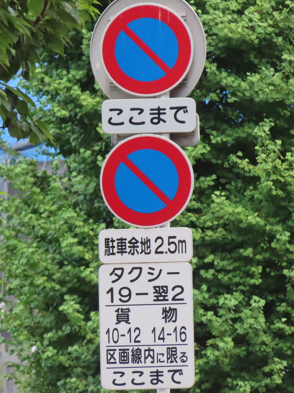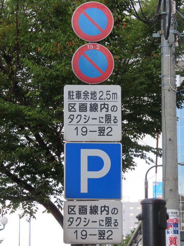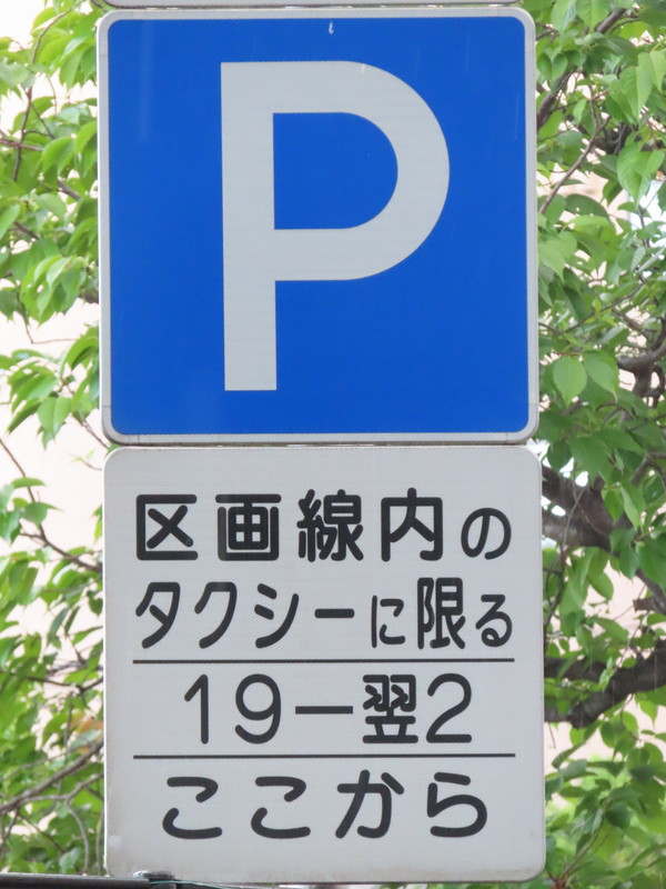 「全車両は終日駐車してはいけない」・「19時‐翌2時のタクシー、10時‐12時及び14時‐16時の貨物は駐車区画線に駐車する場合、右側に2.5m以上の余地を取らなければならない」(駐車余地)・「19時‐翌2時のタクシー、10時‐12時及び14時‐16時の貨物は駐車区画線内に限り駐車することができる」(駐車可)となります。