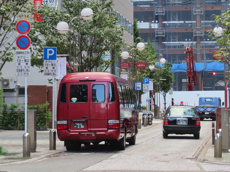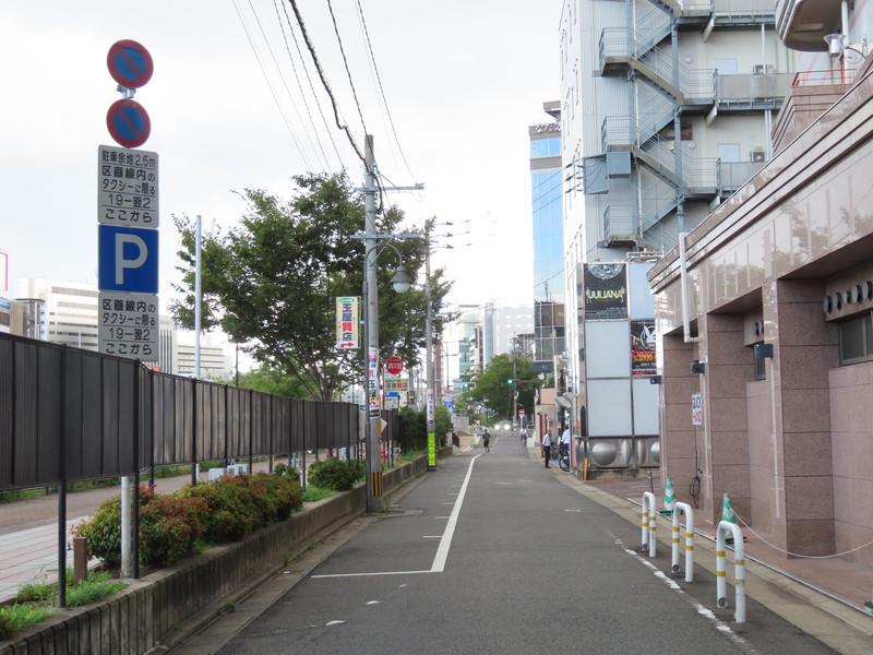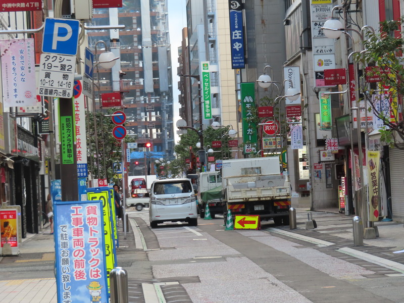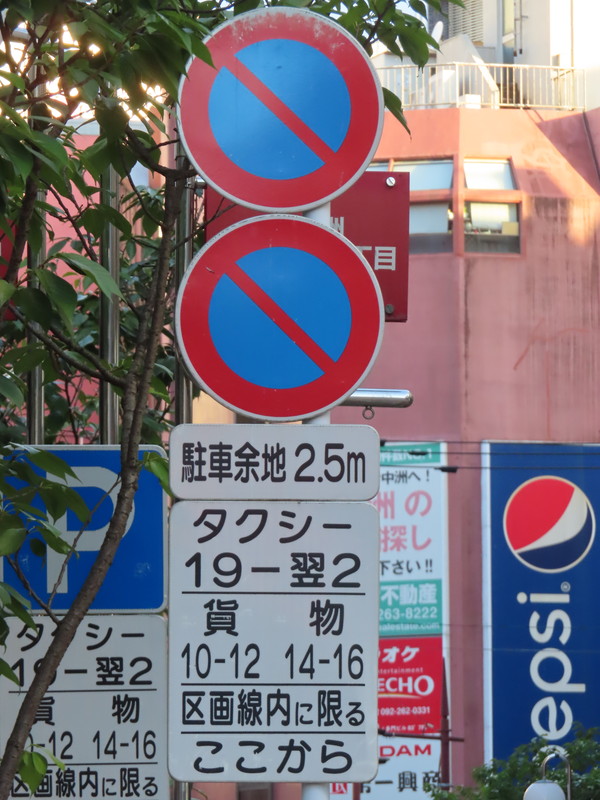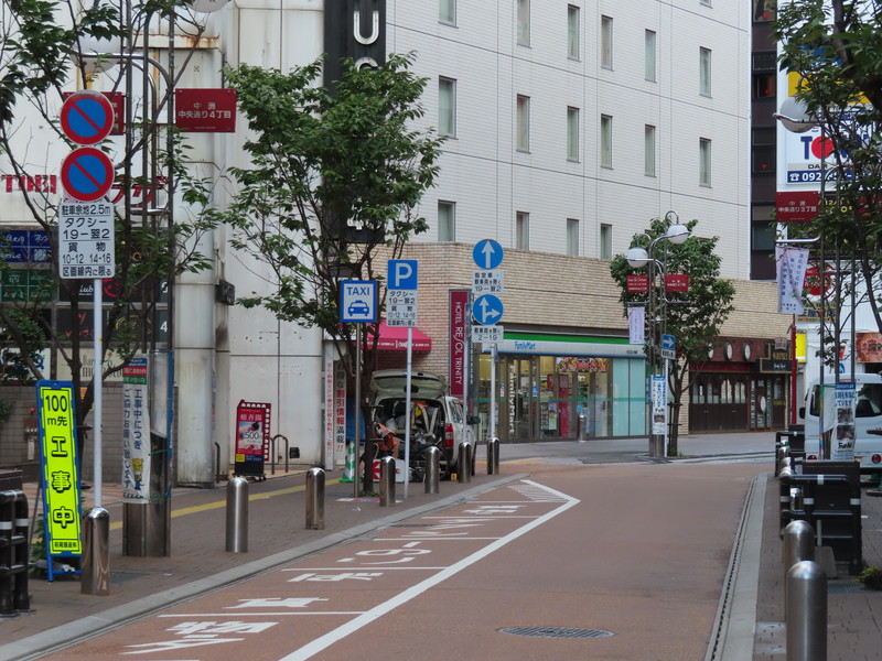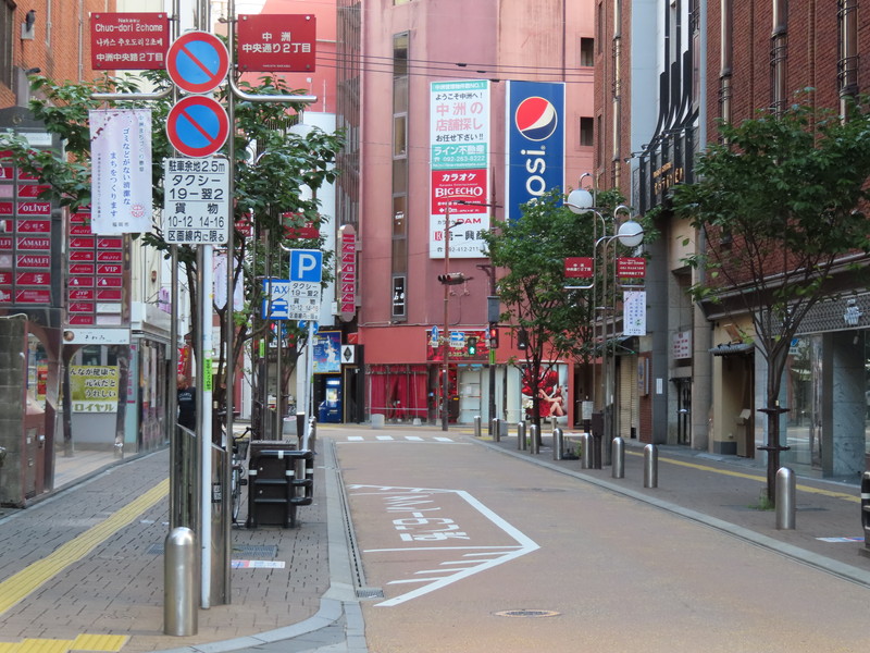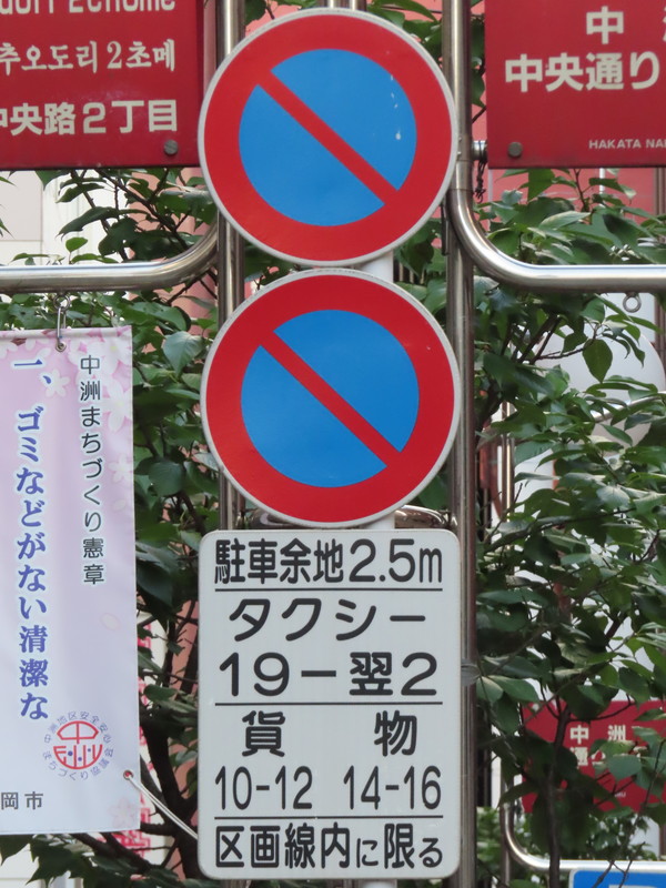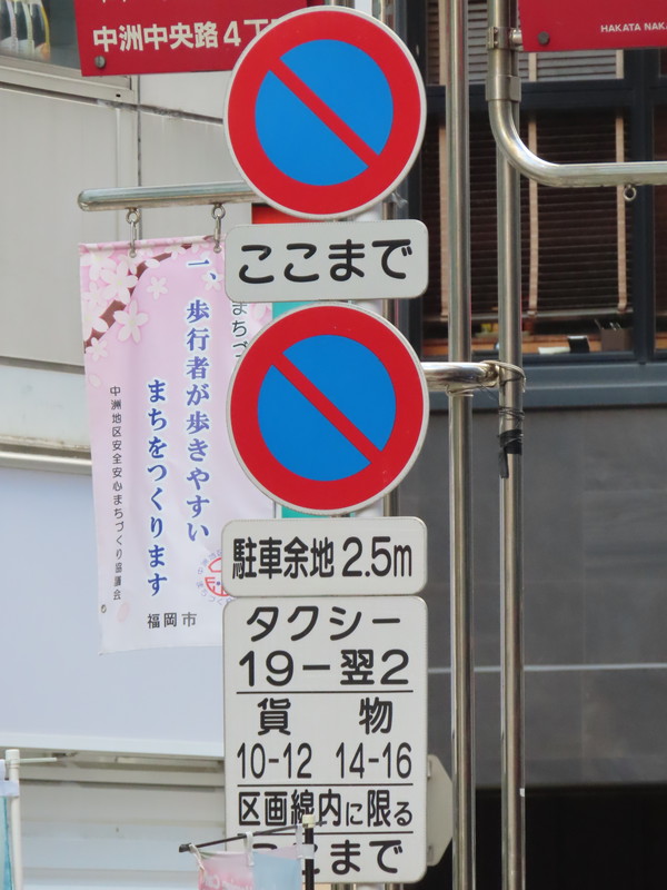 福岡市の繁華街である中洲を通る一方通行路において、「駐車余地」規制を含む駐車関連の規制及び指示が複合的におこなわれています。