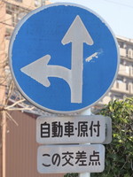 規制されている交差点の奥側に標識が設置されているので、分かりやすいよう補助標識「この交差点」を附置しています。 補助標識「車両の種類」とは1枚の補助標識に纏められていますが、字の太さが若干異なっています。 |