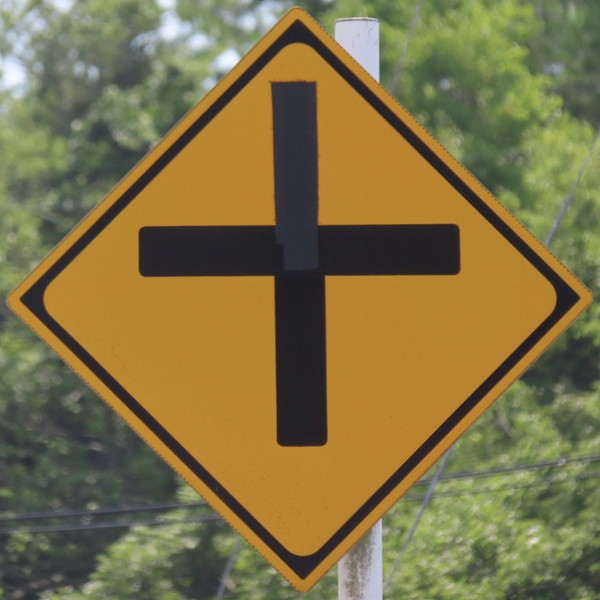 「十形道路交差点あり」の標識ですが、記号が上に寄っていて、少し違和感があります。よく見ると、「T形道路交差点あり」標識の記号上部に黒の縦線を追加し、無理矢理「十形道路交差点あり」にされているようです。