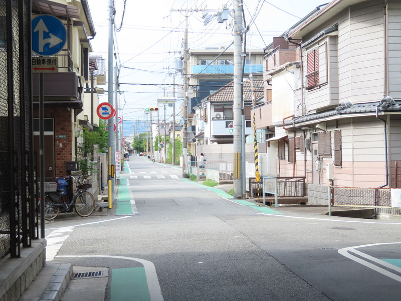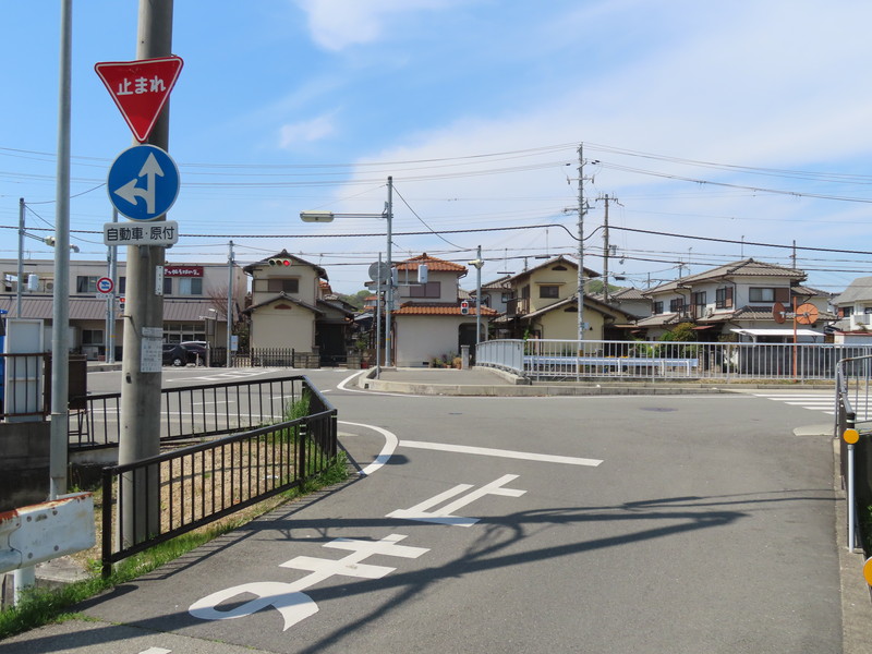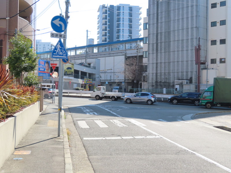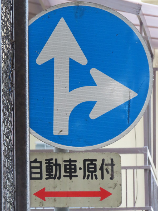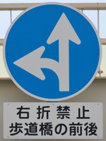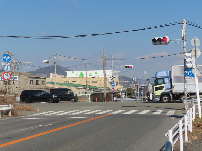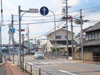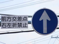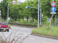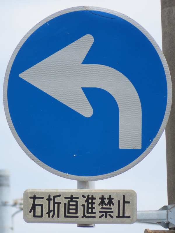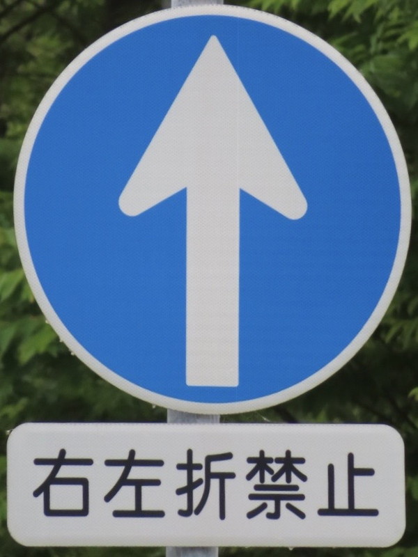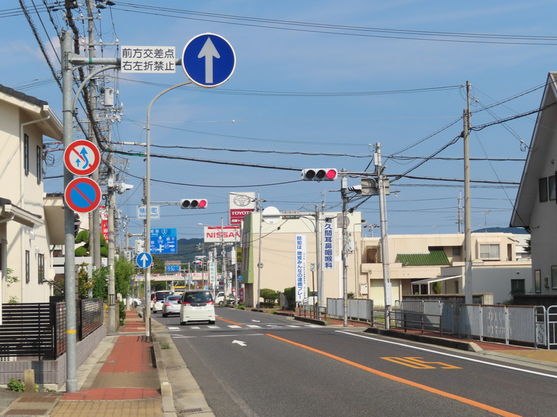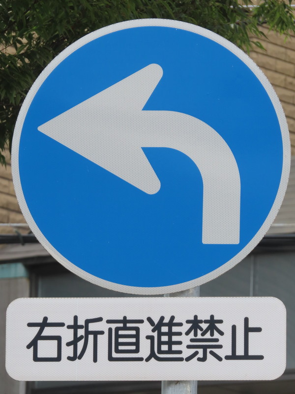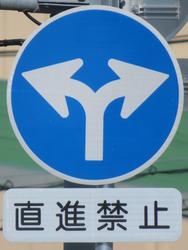 | 「(311-A)指定方向外進行禁止」標識が設置されていますが、実際の交差点の形状は十字路ではなく食い違い型となっており、標識の矢印の向きと厳密には一致していません。 |