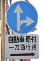 「指定方向外進行禁止」標識に、一方通行関連の黒矢印が表示された補助標識が附置されています。