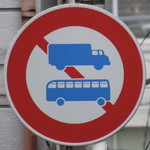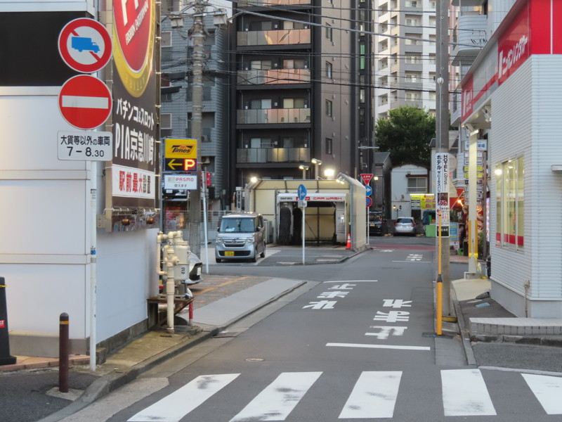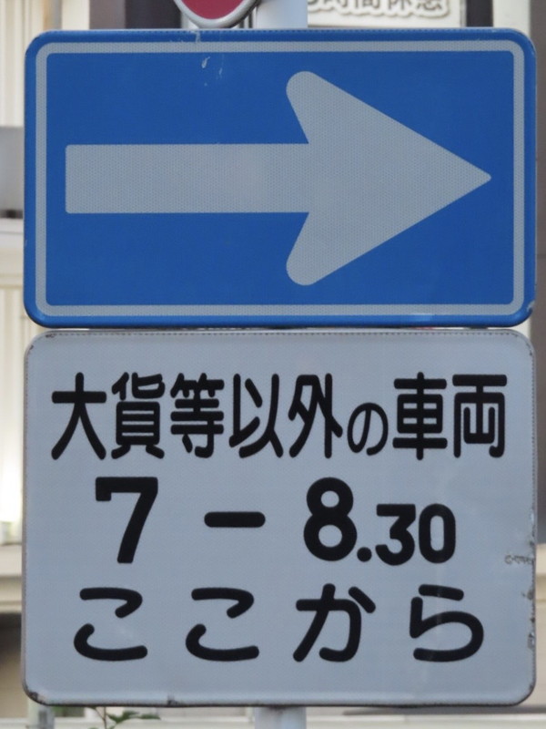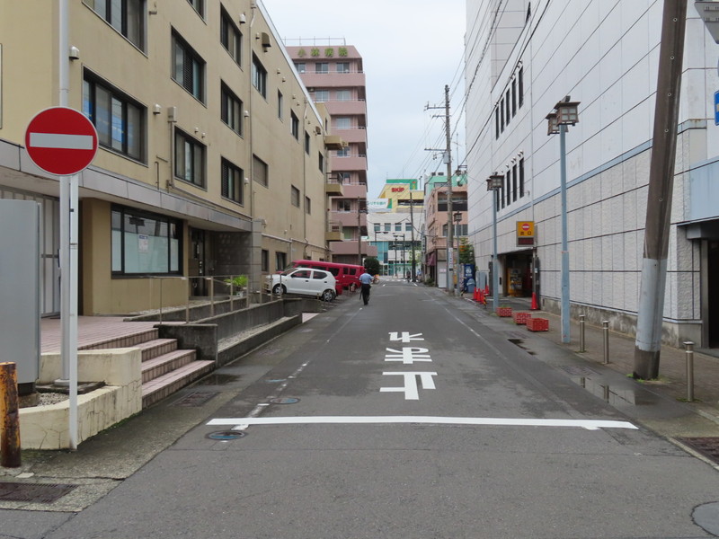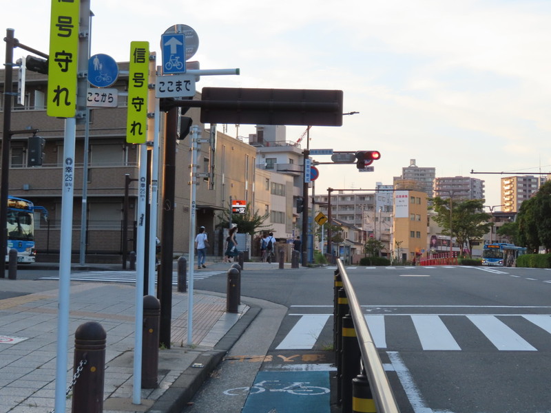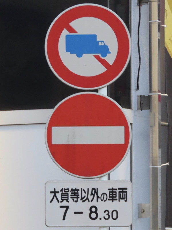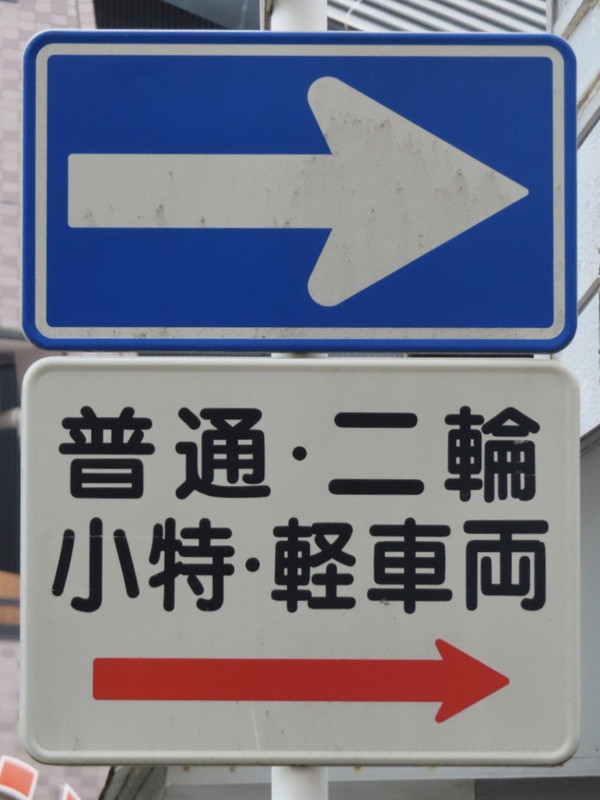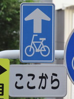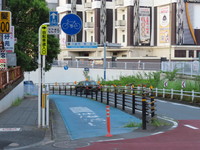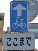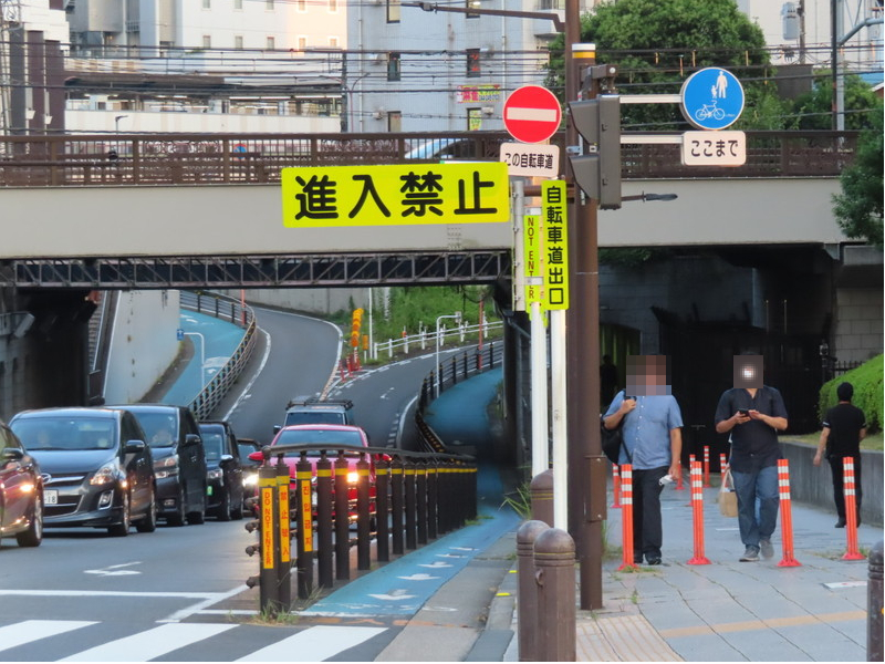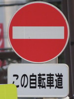 | 鉄道の高架下を抜ける道路で、歩道と車道の間に自転車専用道路が設けられており、ここで自転車左側通行の原則に従い「自転車一方通行」の規制が実施されています。一方通行の出口には「この自転車道」の補助標識が附置された「車両進入禁止」標識が設置されています。 |