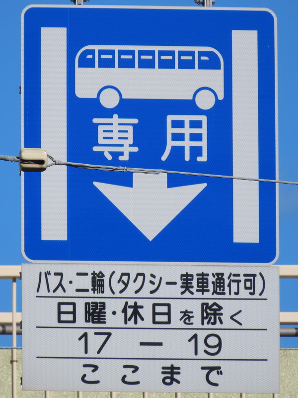 「専用通行帯」規制は、標示板と補助標識で示された種類の車両が規制の対象となるのですが、こちらではタクシー(実車)が「通行可」と通常とは異なる表記となっています。