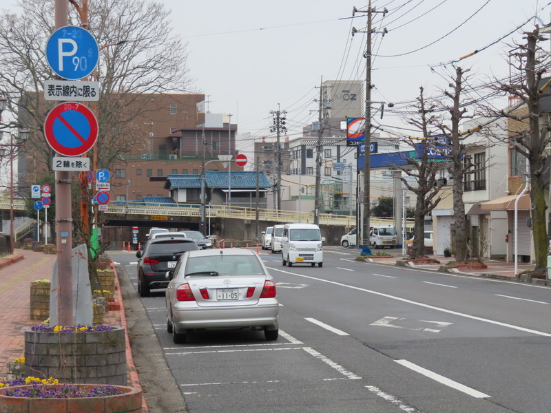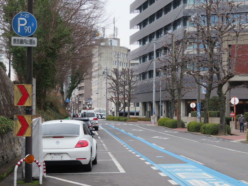 県庁の近くの片側1車線の道路で実施されている「時間制限駐車区間」規制です。デフォルトの60分ではなく、90分となっています。