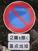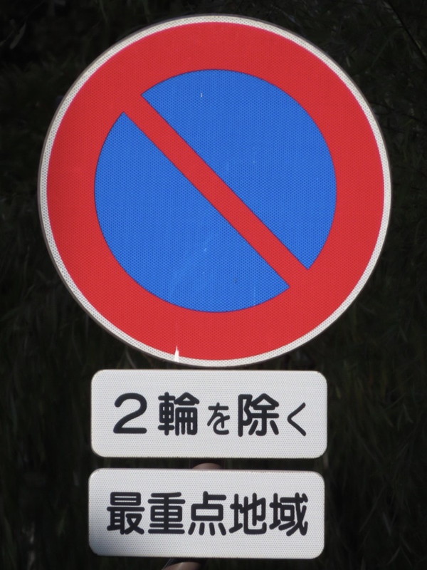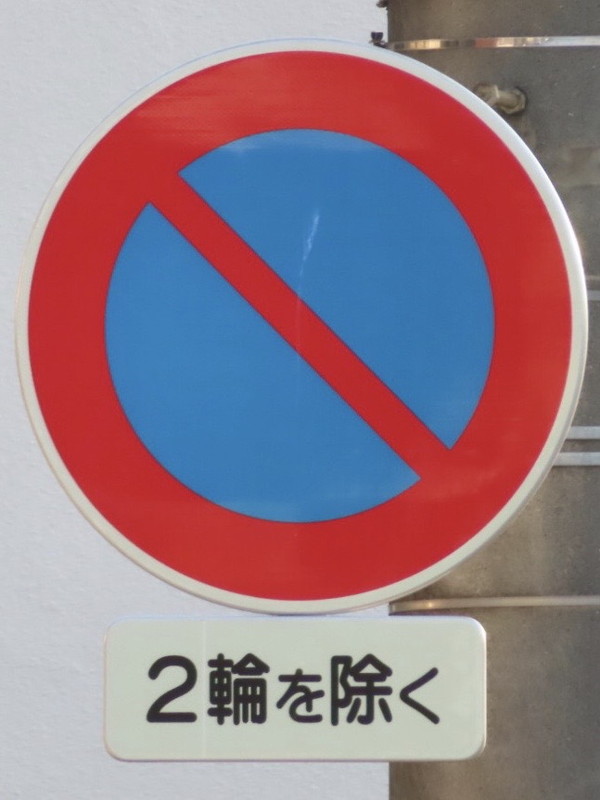 岡山県では、「駐車禁止」規制の多くが「2輪を除く」となっています。自動二輪や原付は規制から除外していますが、自転車などの軽車両は規制の対象としているようです。