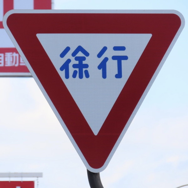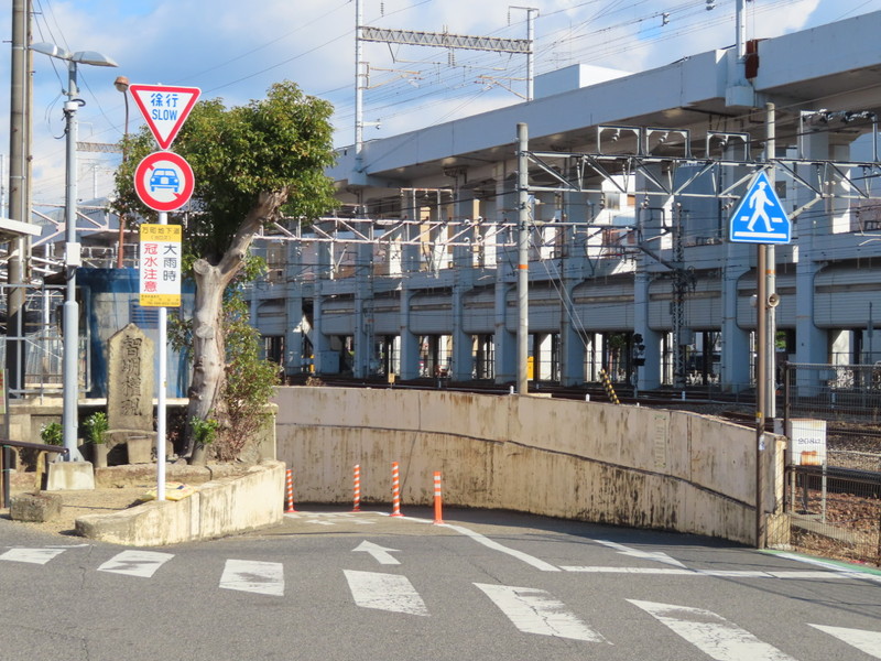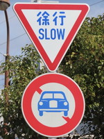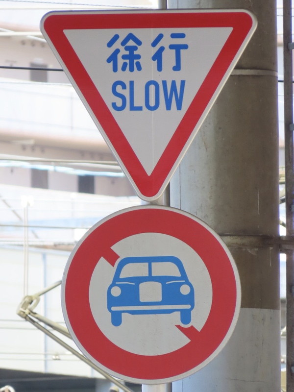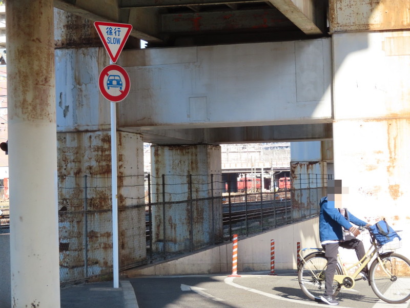 | 岡山駅近くの鉄道下をくぐる狭い地下道で、「徐行」規制が行われています。また、この地下道では同時に、「自動車(二輪を除く)通行止め」規制も実施されています。地下道両端の入口それぞれに標識が設置されています。