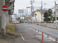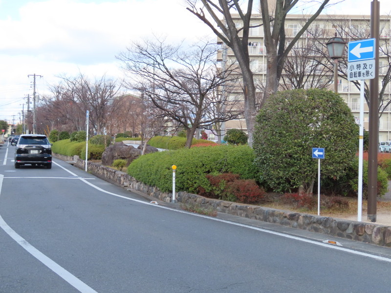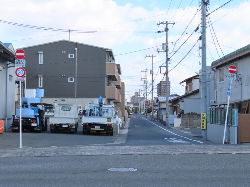 | 「1」近くの、住宅街の中を通る道路幅の狭い生活道路です。こちらの区間は、朝の通勤・通学時間帯のみの規制となっています。 |