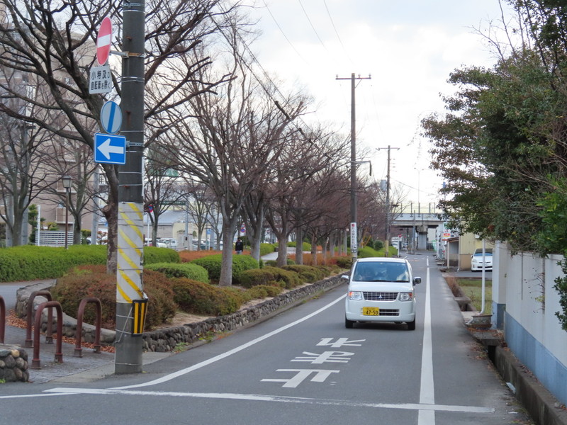 | 高架の国道バイパスに平行する一方通行路です。「一方通行」規制の対象が「小特を除く」となっています。区間周辺には田畑が見られ、農作業用車両を考慮しての規制でしょう。小特の逆走を認めるなら、自転車などの軽車両の逆走も認めて良いと思うのですが。。 |