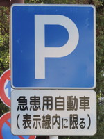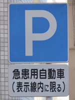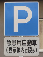 | 内科医院、歯科医院前です。緊急患者が素早く病院で受診できるよう、急患用自動車を対象とした「駐車可」の指定が行われています。駐車枠は1台分あり、枠内には「診」の表示があります。 |