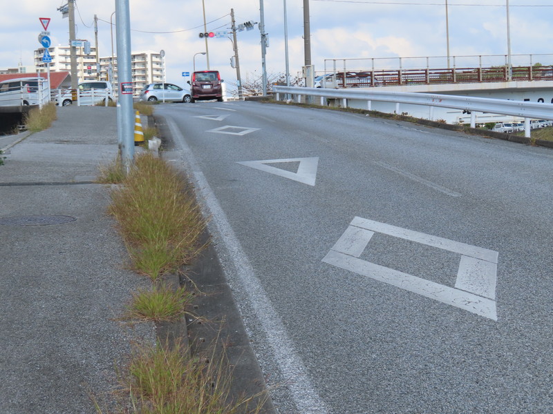 こちらも左折導流路に設置されています。また、路面には、前方優先道路「▽」と横断歩道あり「◇」の標示が交互に設置されています。