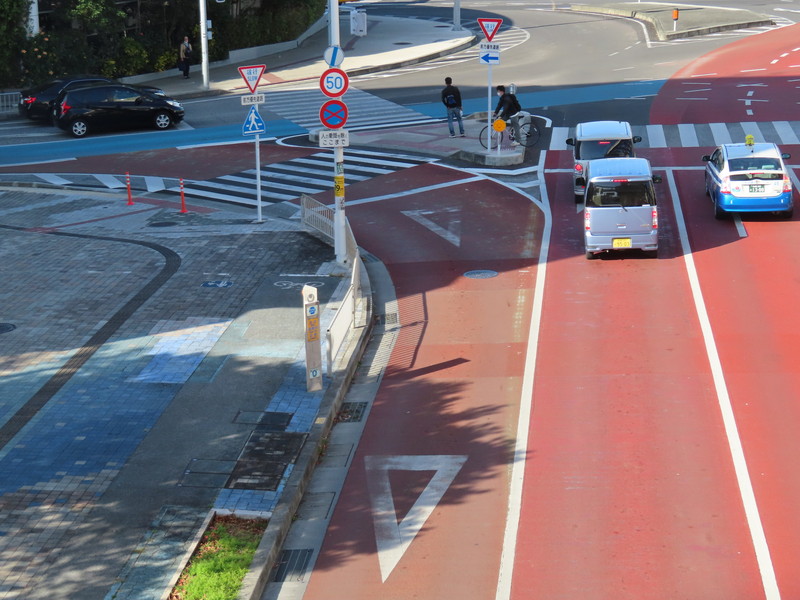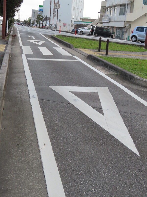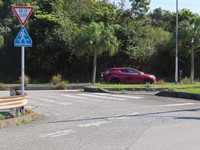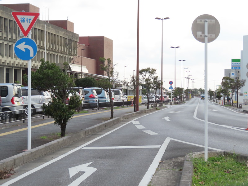 沖縄県では、交差点における左折導流路等の合流部分において、「前方優先道路」標識及び標示が積極的に設置されています。他県では、まず見られません。