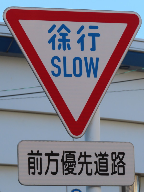 なぜか補助標識が省略されています。これでは単なる「徐行」であり、交差点内での優先関係を示すものではなくなってしまいます。路面には「前方優先道路」の標示が設置されています。