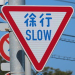 こちらも左折導流路に設置されています。右側の標識は既存の標識に無理やり「SLOW」と書かれたテープを貼ったのでしょうか?かなり窮屈です。