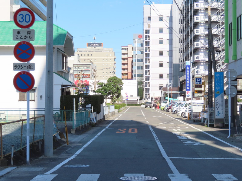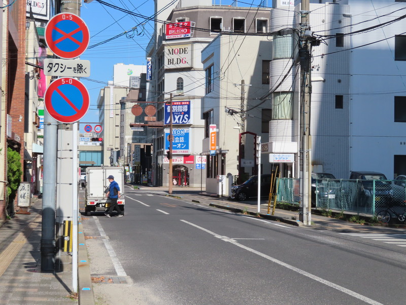 JR佐賀駅周辺では、深夜の時間帯、タクシーを除く全車両を対象に「駐停車禁止」規制が行われています。区域で行われている規制のようで、閑静な住宅街の道幅の狭い生活道路も一部対象となっています。対象区域内では、このような道路であっても、家の前での人の送迎、少しクルマを停めて荷物を下ろすといったような行為も禁止されるわけです。なかなか物々しい雰囲気です。