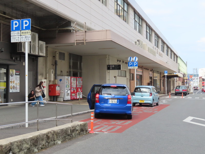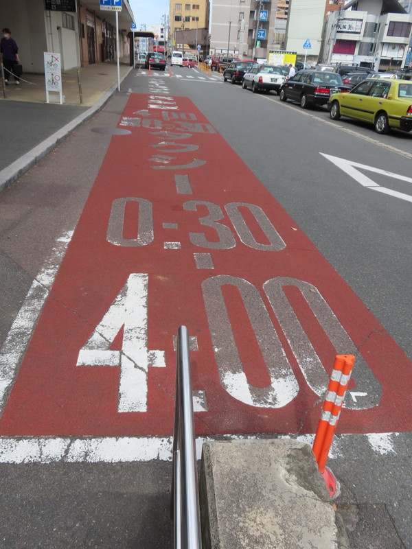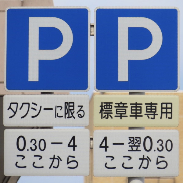 松江駅前の指定区間です。指定時間は4時から翌日の0時30分までで、それ以外の時間帯はタクシーを対象としています。また、終点の標識では時間の表示が省略されています。