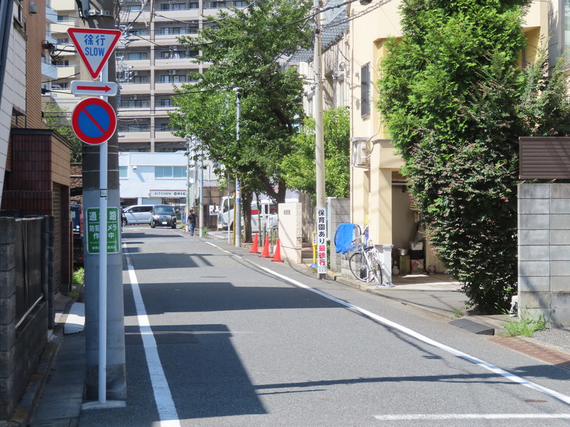 ここでは、保育園の前を通る区間約60mで「徐行」規制がおこなわれています。なお、こちらは対面通行の道路で、対向側も同様に規制がおこなわれています。