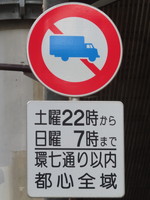 | 区域「環七通り以内都心全域」の範囲において「大貨等通行止め」の規制が実施されています。土曜深夜から日曜朝までの週1日のみですが、騒音・振動等の交通公害対策のために規制がおこなわれています。 |
