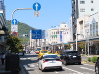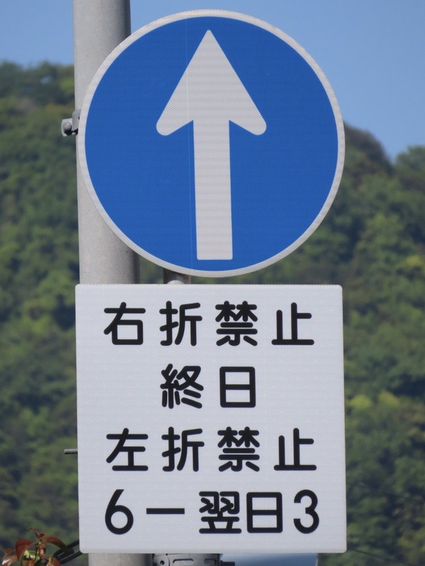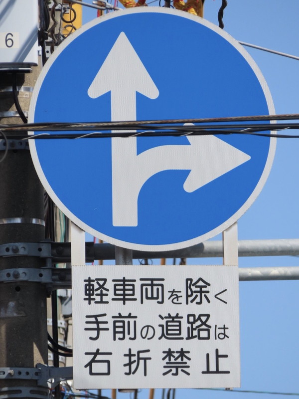 「手前の道路は右折禁止」。「キ」型交差点で、手前側の交差道路が左行きの一方通行、奥側の交差点が右行きの一方通行となっていますが、この本標識は奥側の交差点のみを対象としているので、補助標識にこのような補足事項が書かれています。