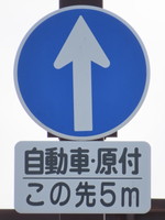 | 富山県では、規制対象の交差点の少し手前に「指定方向外進行禁止」標識を設置する場合や、規制対象の交差点が分かりにくい場合、「この先●m」と表示された補助標識が附置されます。 ここでは、手前の信号交差点から約5m先の交差点で、右折を禁止していますが、交差点が短い区間で連続していて対象交差点が分かりにくいため、補助標識に「この先5m」と表示しています。 |