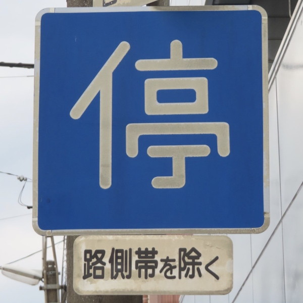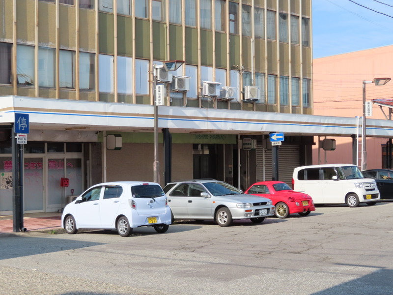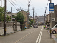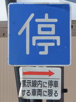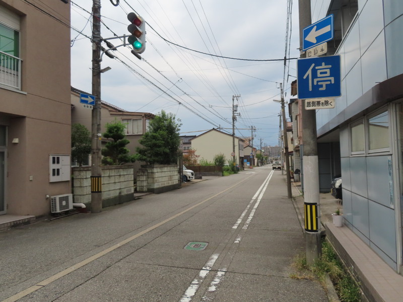 南富山駅西側の一方通行路の右側が「停車可」に指定されています。指定区間は商店街に隣接しており、周辺も広場のようになっているので、駐車しても問題なさそうに雰囲気に見えますが、実際には違反です。なお区間内には、直角駐車の標示が設置されています。