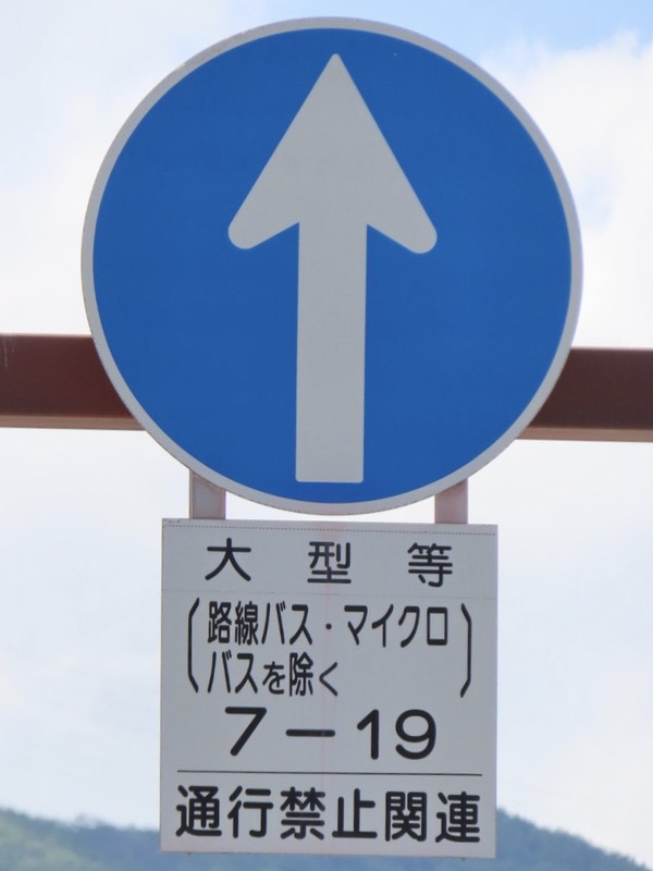 こちらの画像の例だと、交差道路において、大型等通行止めの規制がかかっているため、補助標識には「通行禁止関連」と表示されています。 |