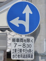 | こちらの場合は、当該交差点での右折路において、朝の通学の時間帯のみ歩行者専用の規制がかかっているため、補助標識には「歩行者専用道路関連」と表示されています。 |