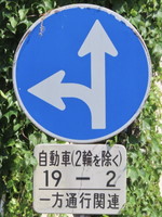 | こちらの場合は、交差道路において、一方通行(左行き)の規制がかかっているため、補助標識には「一方通行関連」と表示されています。 |