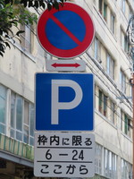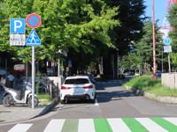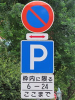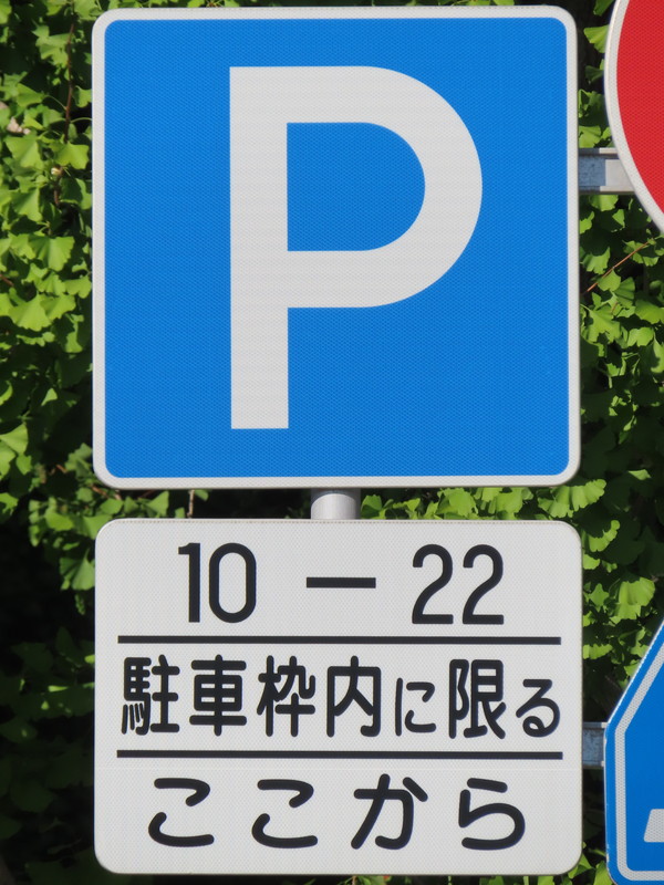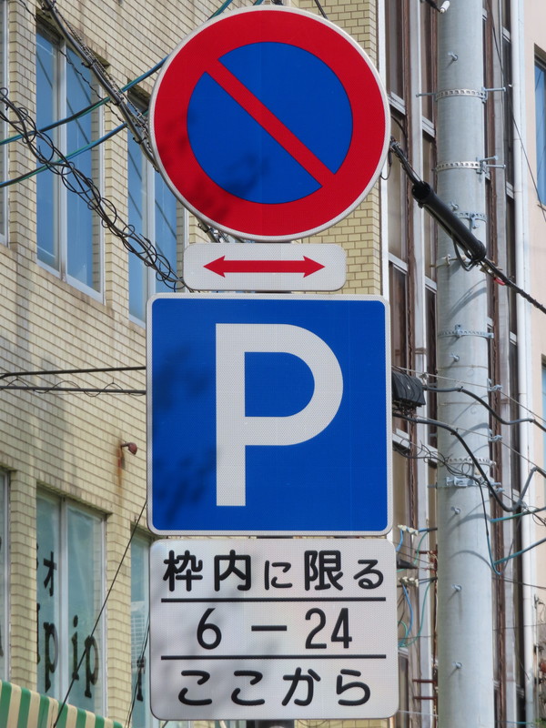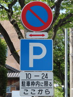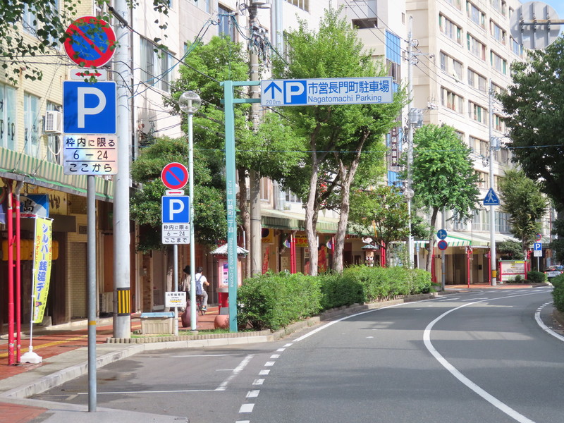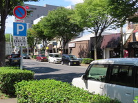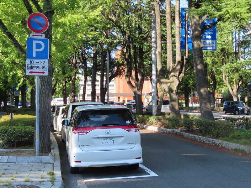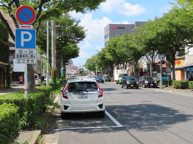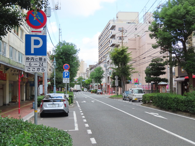 市街地の両側に商店が並ぶ片側2車線の道路左側で、全車両が「駐車可」となっています(指示時間は10時~24時)。区間内には、駐車枠(平行駐車)が設置されています。