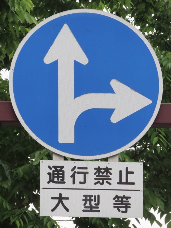 | 交差道路側の一方通行関連の規制ですが、その一方通行路には「大型等通行止め」規制が実施されているため、親切にもこのような表示がされています。(正確には「大型」ではなく「大型等」です)