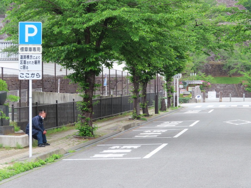 舞鶴城跡公園南の広めの一方通行路に指定区間があります。駐車枠は4台分あり、枠内には「標章車」の法定外表示がペイントされています。対象時間は終日です。