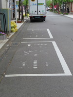 両側に商店が並ぶ一方通行路に指定区間があります。駐車枠は2台分あり、枠内には「標章車」の法定外表示がペイントされています。対象時間は7時から22時までです。